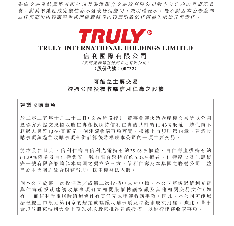 10月22日晚间,信利国际发布公告,公司计划通过公开投标方式收购仁寿产业投资所持信利仁寿的约11.43%股权,总代价不超过10.5亿元。